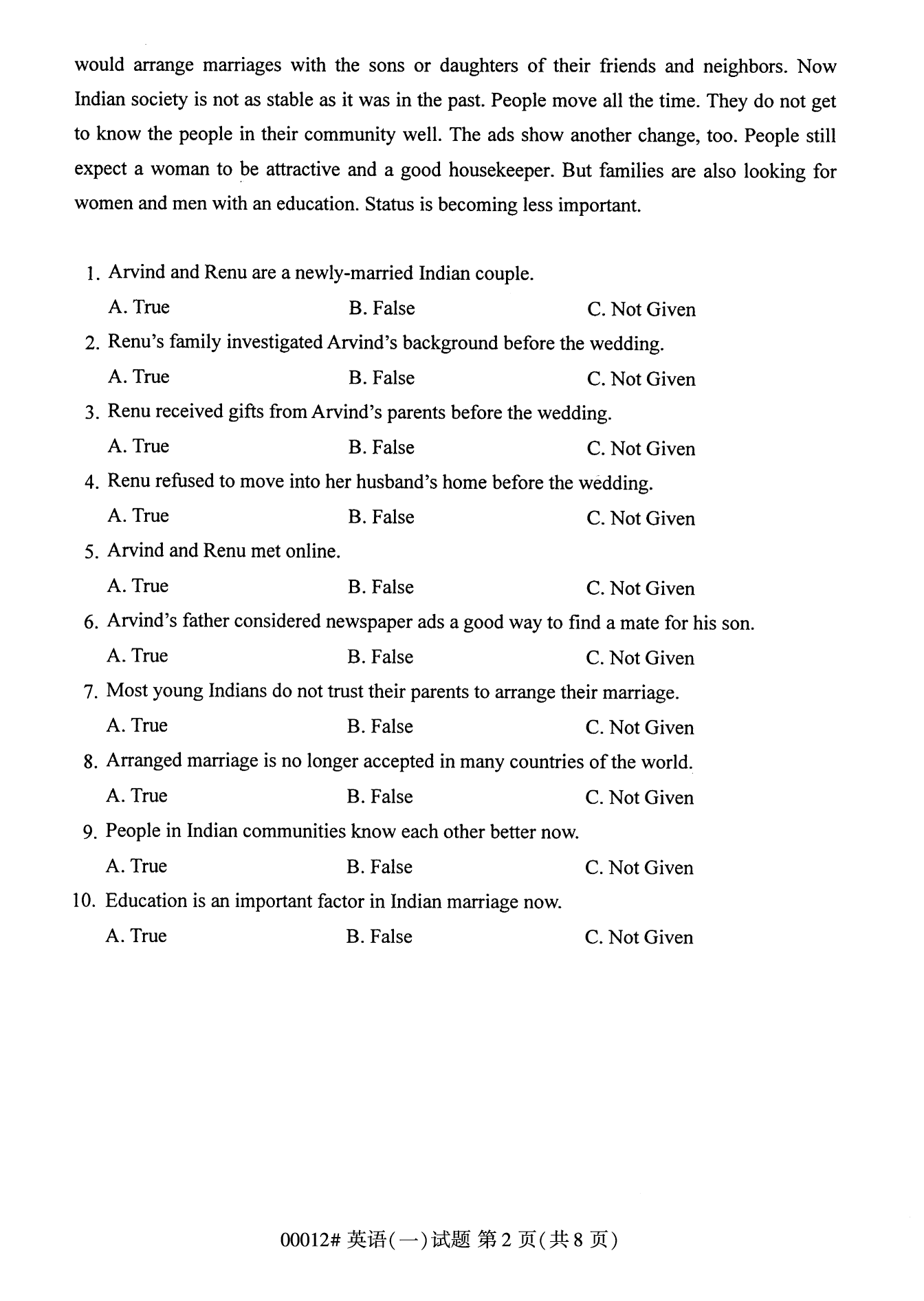 2022年10月重慶自考00012英語(一)試卷